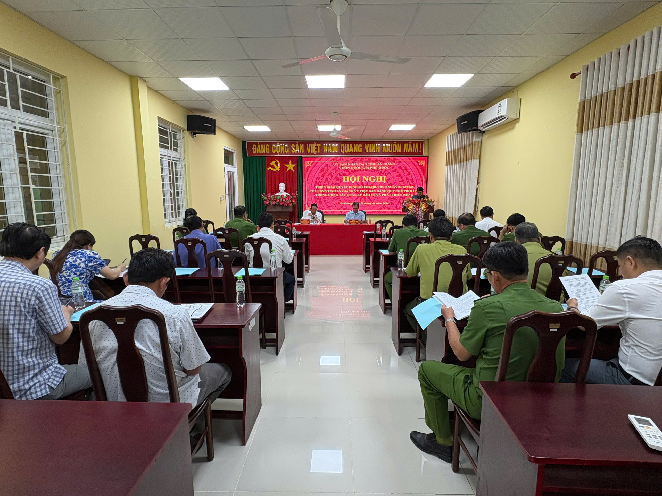 Tại hội nghị, đại diện Ban Giám đốc Vườn Quốc gia Phú Quốc đã công bố và quán triệt toàn văn nội dung Quyết định số 2233/QĐ-UBND của UBND tỉnh, đồng thời quy định phạm vi điều chỉnh, đối tượng áp dụng, nguyên tắc, nội dung và hình thức phối hợp giữa các lực lượng liên quan. Các đại biểu tham dự đều thống nhất nhận định: việc ban hành và triển khai Quy chế là yêu cầu cấp thiết, phù hợp với thực tế trong công tác quản lý, bảo vệ rừng hiện nay.